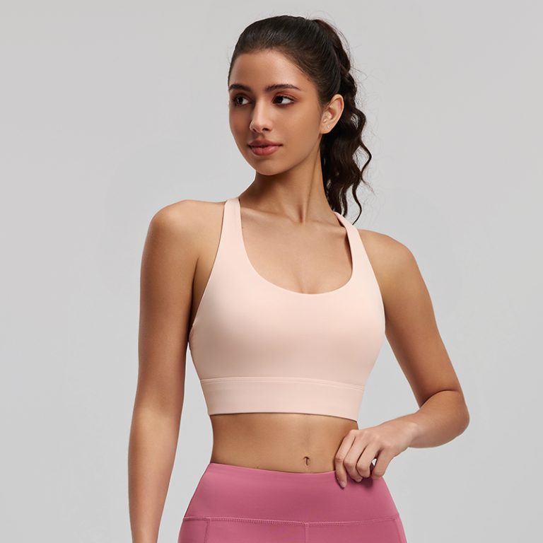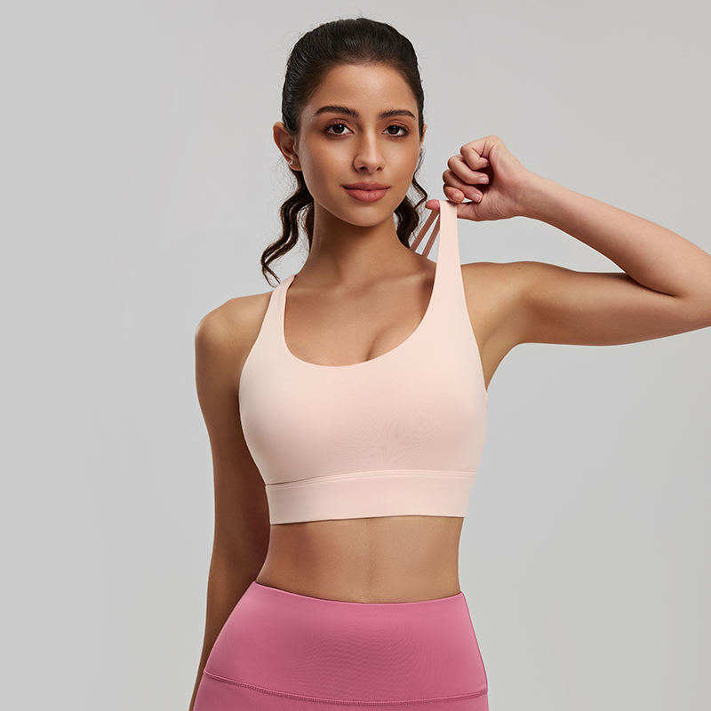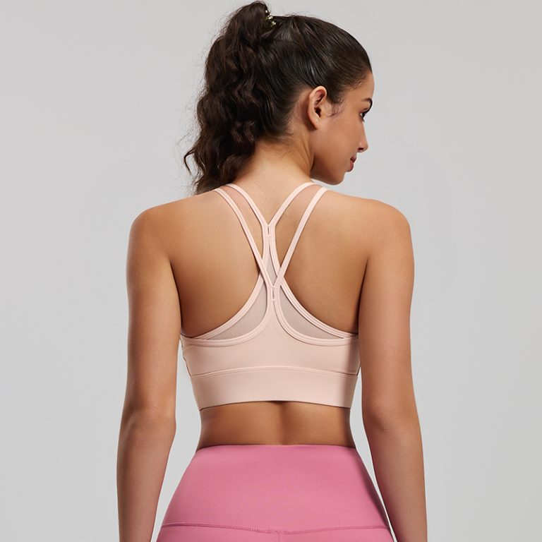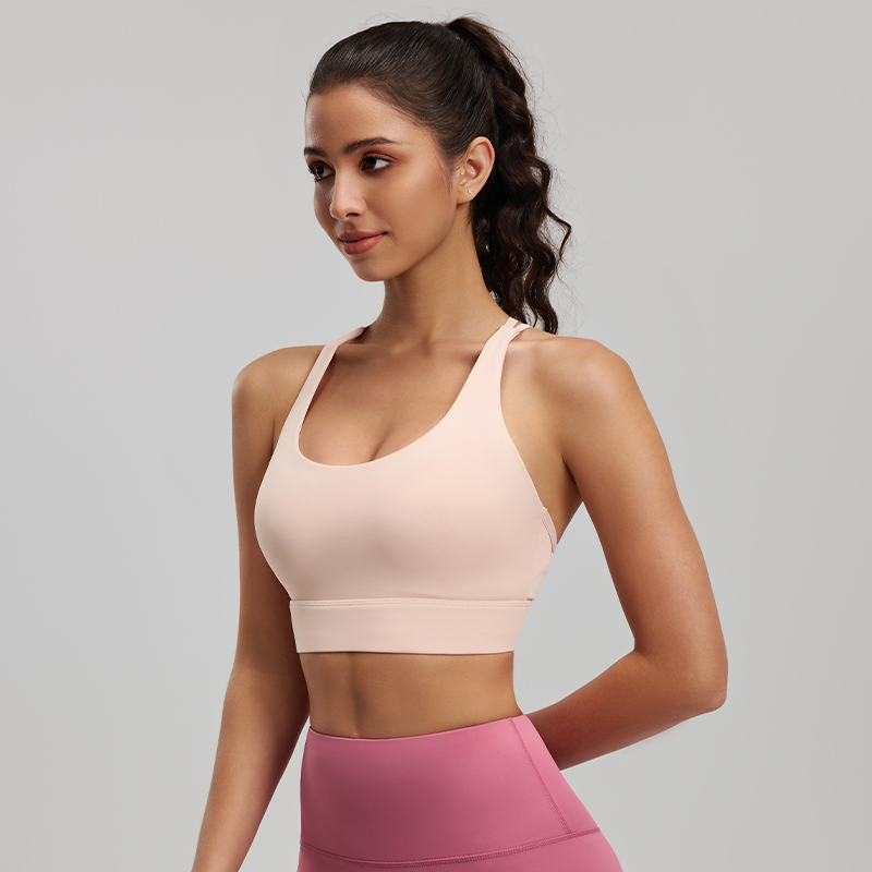 Nude pink strappy sports bra with stretchy, skin-friendly fabric. Crisscross back with breathable mesh panel, medium support, ideal for yoga and workouts.