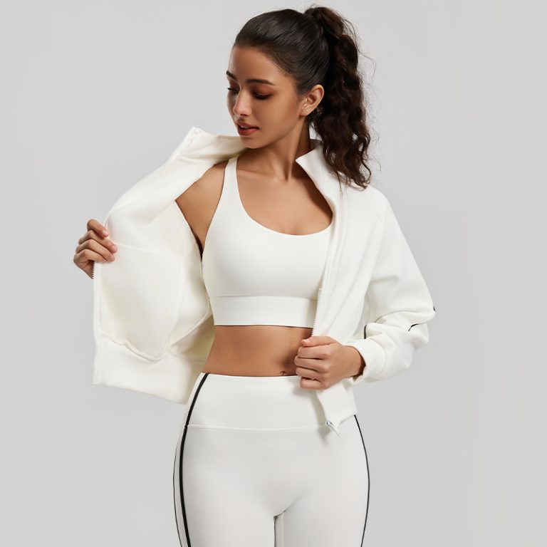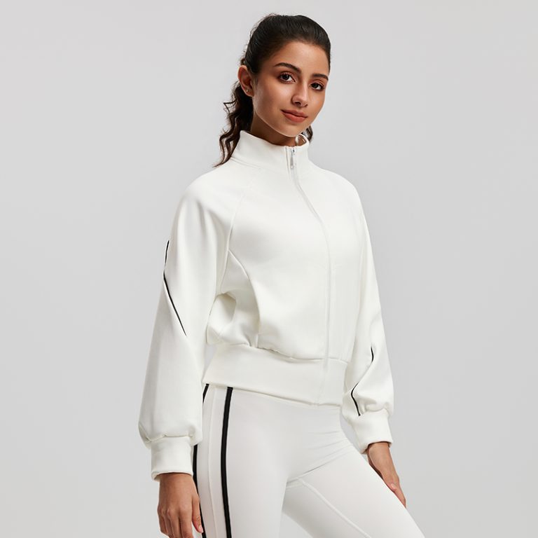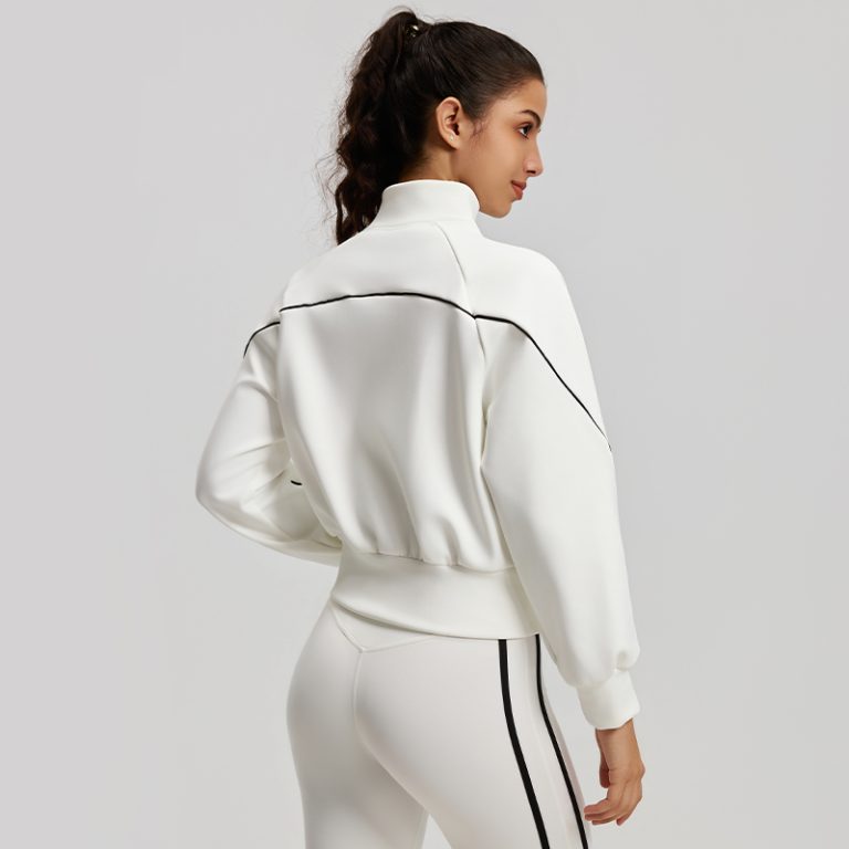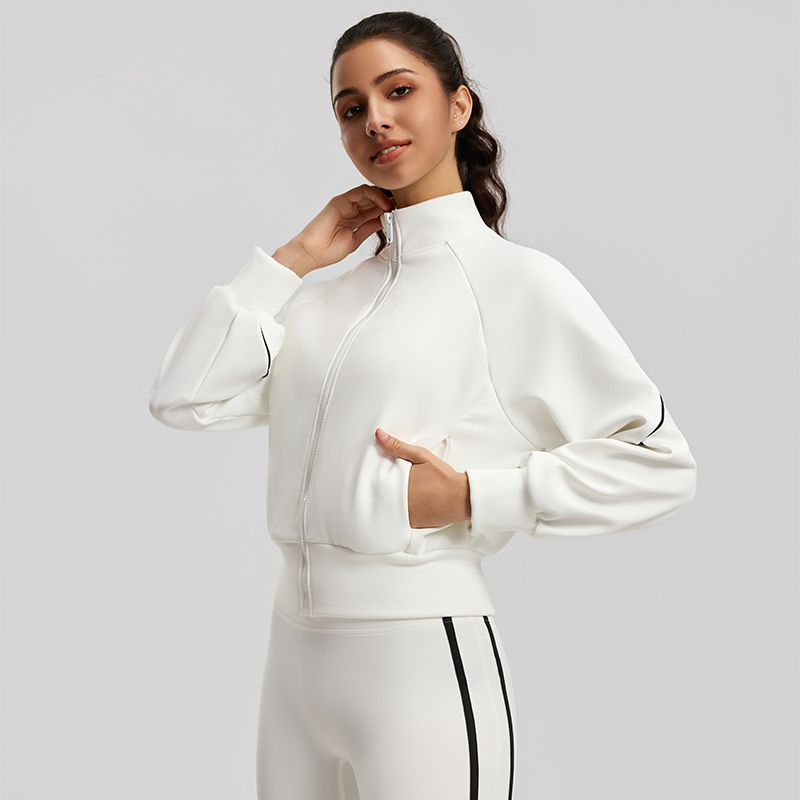 This stand-collar zip-up sports jacket is made of air-layer fabric, which is soft and structured. Accented with black-and-white contrast lines, it boasts a minimalist yet stylish design. The cropped waist and loose lantern sleeves create a flattering, clean silhouette, suitable for fitness, daily wear, and various occasions, effortlessly achieving a vibrant sporty look
