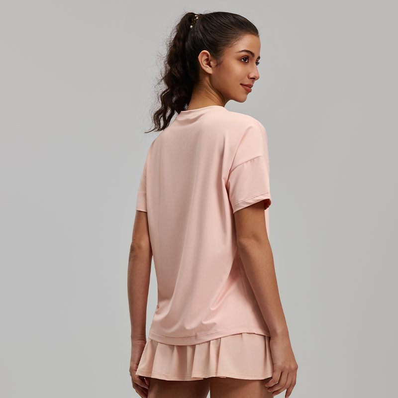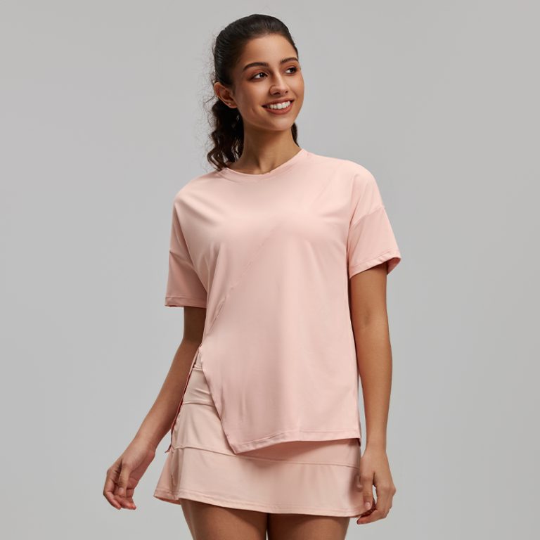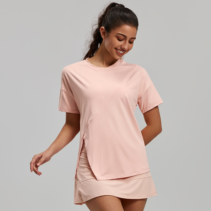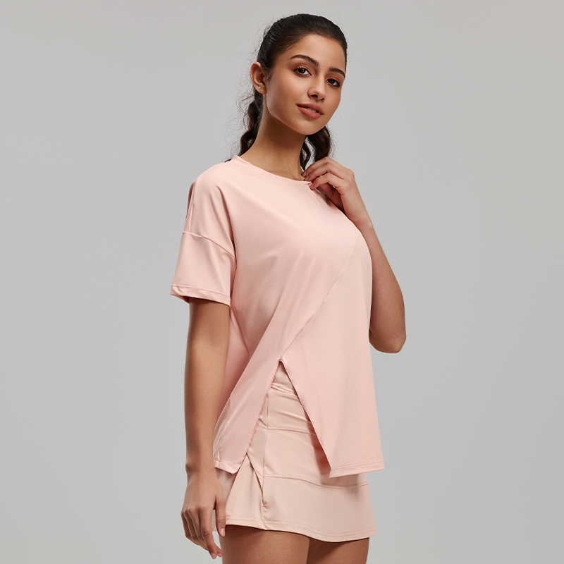 Light pink loose-fit sports tee with breathable quick-dry fabric. Side slit design offers unrestricted comfort, perfect for yoga, running, and casual daily wear.